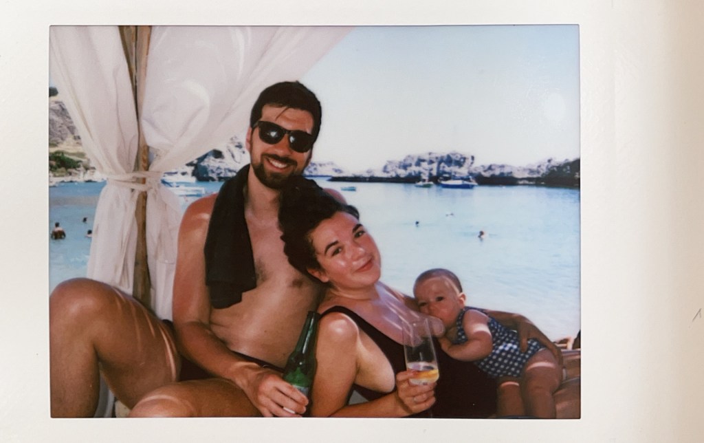 Mike delivers beers in chilled, plastic mugs. Luna shows off some tricks from swim class, then gets tired and fussy. I feed her in the shade while I read my book and drink my cold Mythos. Her eyelids close and I savour her wet body tucked into mine. I put her down in the pram and try to continue reading, but get pulled into the family gossip happening poolside. We find new ways to talk about old news. Sip, dunk, giggle. Dad brings crisps from the shop across the street. Luna snoozes. I feel the buzz from a beer in the sun on an empty stomach.