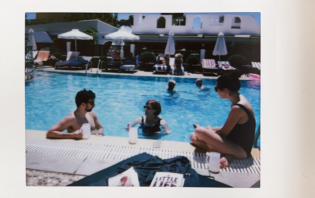 For the rest of the afternoon, we rotate positions in and out of the pool, scootching sunbeds in and out of the shade. Red noodle lady never leaves the pool. Daniel and Zoe pass a volleyball back and forth and I see their thirteen and eleven year-old selves surrounded by the same characters, same Grumpy Git. The playlist starts to repeat itself. We leave this portal and its residents suspended in time for another 20 years.