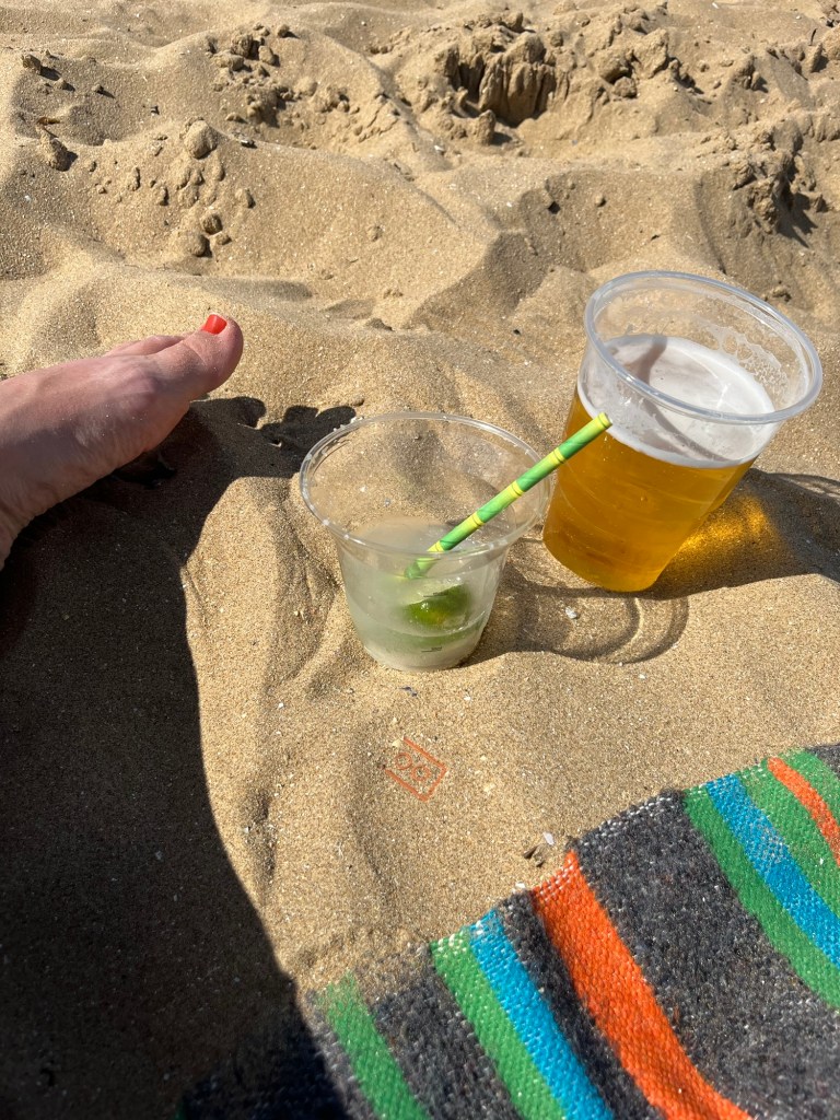 I have a frozen margarita. We don’t have our kid, so we watch other people with their kids. A couple next to us are playing with their two (about four and seven), digging, chasing, snuggling, splashing. Some child free couple friends come to sit with them for a time, chatting before agreeing to see each other again in August. The parents become people in their own right, not just facilitators of these children.