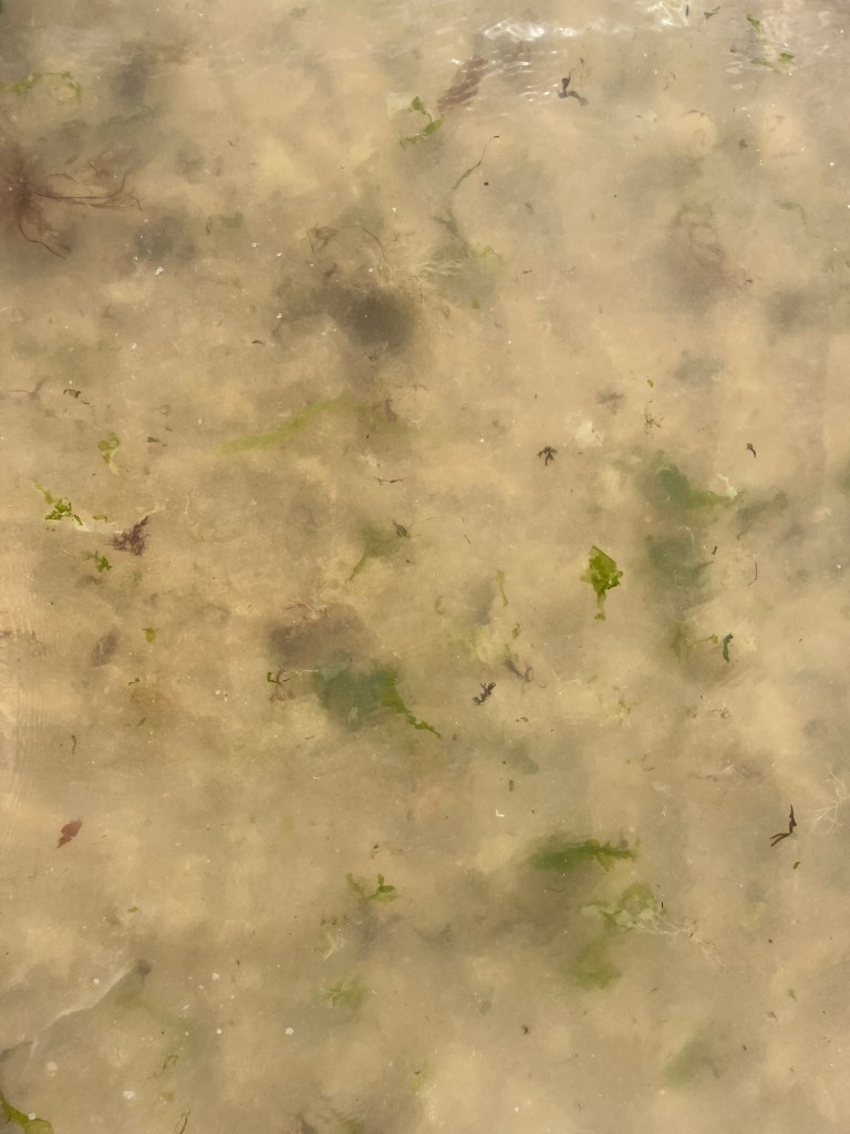 Low tide exposes mossy rock pools. No one else had landed here yet, apart from a group of older women a ways into the water, standing in a circle, doing some coordinated stretches. It is quiet and still.