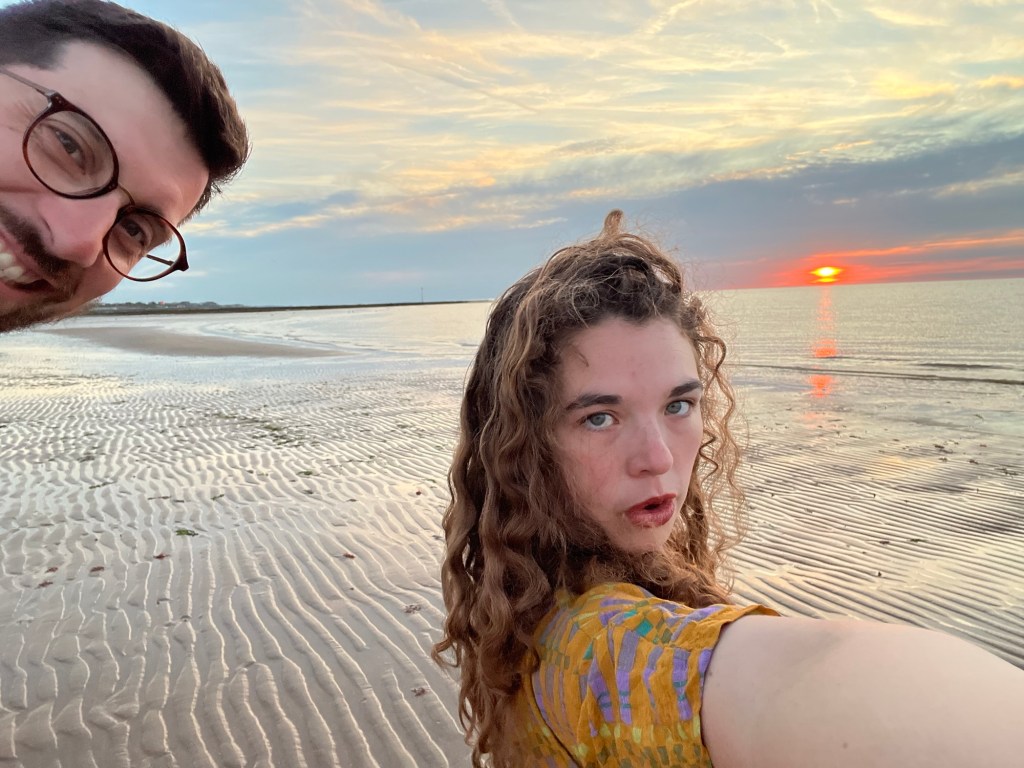 At sunset, the tide is low, so we walk out to the spot where I was under water earlier and watch the bright orange egg yolk squish against the horizon until it’s gone. We’re tipsy and take many selfies.
