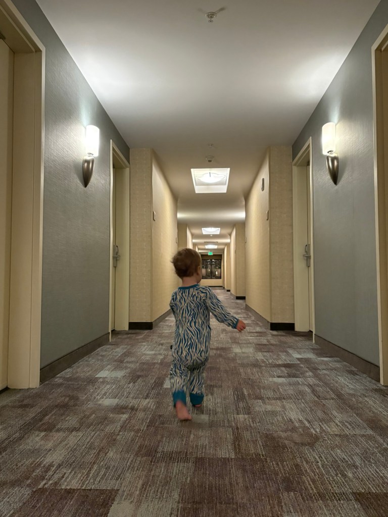 After the first sleep, we wake up at 4:45am. Luna looks out at the highway from our ninth floor hotel room window and excitedly points out cars as I feel queasy looking down at the distance below. “How about… we sing… twinkle twinkle?” she strings together as we look at the stars. I am taken aback by every sentence, even thought it’s an increasingly common feature of her speech. We run up and down the empty hallways, her Pixar feet padding along as her hips wiggle inefficiently from side to side. If she had a tail it would be wagging. I’m sleepy but happy in this quiet before things get loud. Luna turns two tomorrow.